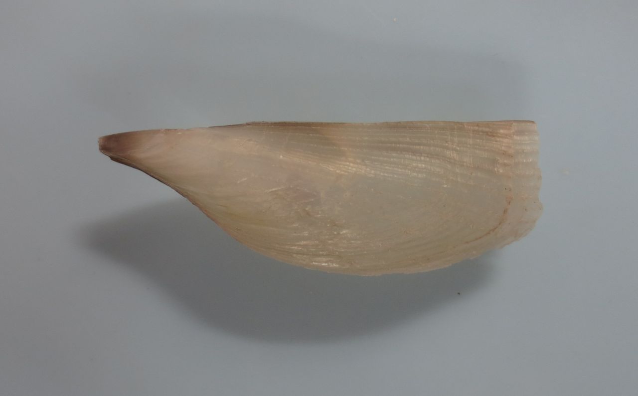 2019年10月08日 Pinna epica Pinna epica Jousseaume 1894ハボウキガイ科スミス列岩近海サンゴ網水深150m~200m 156.5㎜ 1998年採集この学名Pinna epicaは、カラボウキガイにあてられている学名です。殻は非常に薄く、殻表面には突起はありません。日本のカラボウキガイは、この貝によく似ていますが、もう少し殻が厚く、殻表に小さな突起を伴った放射肋があり、この貝のように成長線以外はない貝とは少し違います。もちろんこの仲間には、突起の有無は変異の範囲と思える種類もたくさんありますので、一概に別種と断定できないかもしれません。